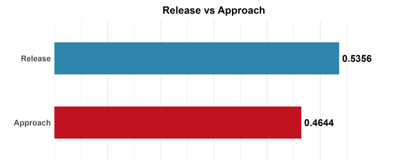 Shown in this figure, when grouped by release and approach, release-based KDE components accounted for 0.5356 of the signal, compared to 0.4644 for approach-based components. Again, while the gap is small, it points to the notion that release similarity contributes slightly more to run prevention than late-stage break alone.